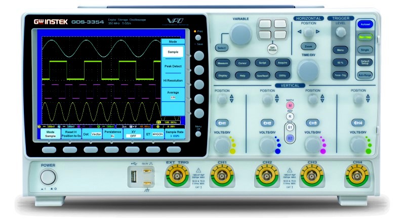 GDS-3154 series oscilloscopes offers a split-screen allowing each input channel to be operated independently with respective setting and waveform display. This provides users flexibility to use as a multi-scope-in-one. Other features include; real time 2.5GSa/s or 5GSa/s sampling and visual persistence oscilloscope (VPO) technology, displays waveforms truthfully and captures less-frequently-occurred signals, like glitches or runts, simultaneously without missing any spot of waveform information. 100GSa/s ET sampling rate (10ps pt-pt resolution) is provided to accurately reconstruct repetitive waveforms avoiding software interpolation distortion. Real-time sampling combined with a good variety of trigger selections enable the capture of fast and complex signals and display waveforms with sinc interpolation. 8″ LCD with SVGA (800 x 600) resolution providing an ample display space to accommodate multiple waveform signals, on screen menu, setting status and associated measurement information, giving all-at-a-glance convenience.
