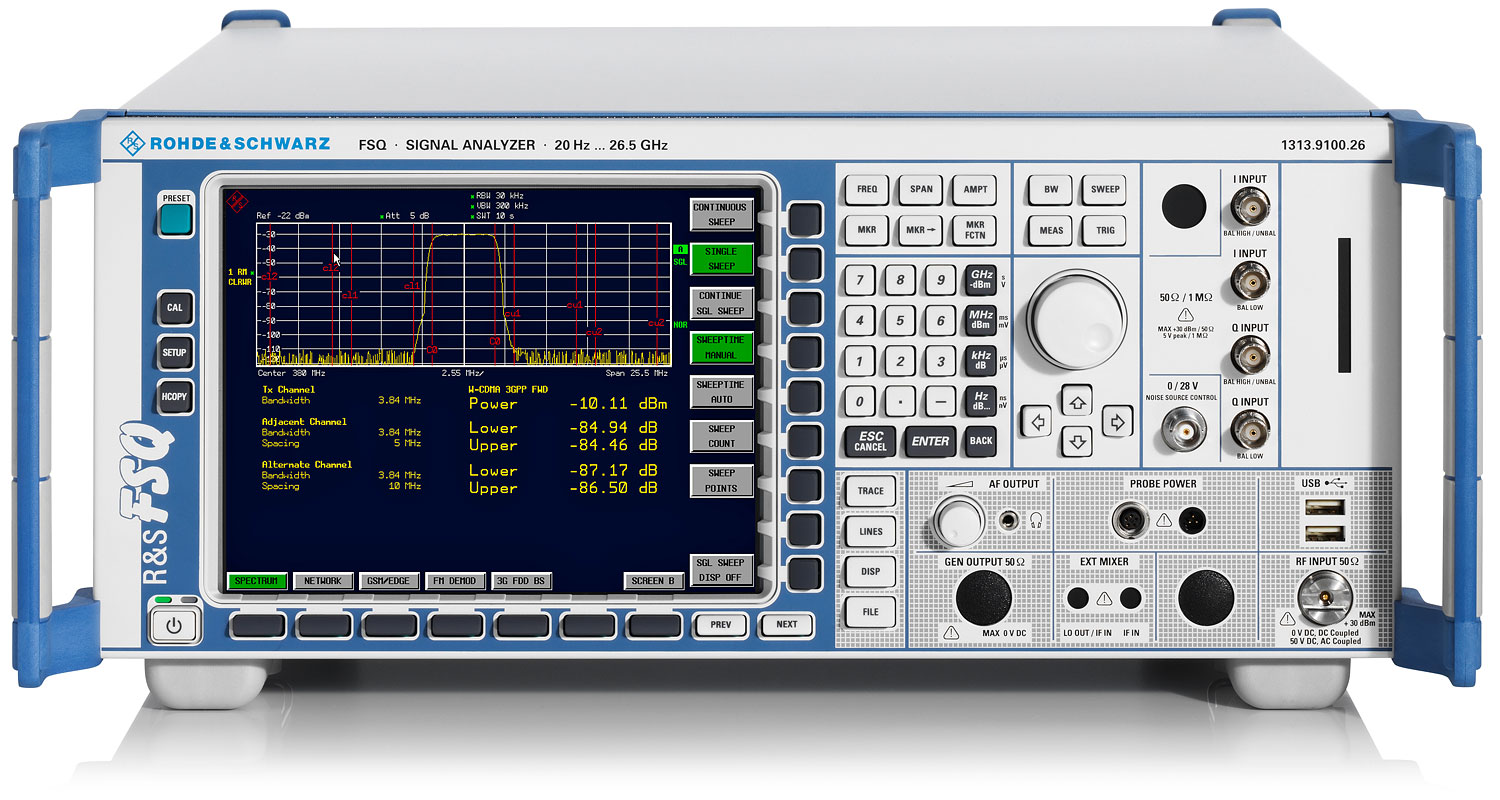 The Rohde & Schwarz FSQ26 High-End Spectrum & Signal Analyzer, 20 Hz – 26.5 GHz is the solution for all development and production measurement tasks. It offers very low phase noise, unsurpassed low residual EVM, a wide dynamic range and above-average accuracy, making it the ideal high-end measuring instrument for development applications, where tolerances and limit values must often be lower than defined in a standard.